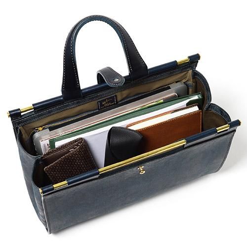 大きく開く口元の開閉は、特注で作った真鍮製の二本のバー、背側に取り付けられた持ち手を前側にくぐらせると口元が閉まり、ショルダーベルトも両サイドに繋がっていて、肩にかけると口元が閉まる構造になっている。持ち手・ショルダーともはBUTTERO(イタリア・ワルピエ社)を使用し頑丈なおかつコバ処理も手作業で磨きこみ美しい色を引き出しています。